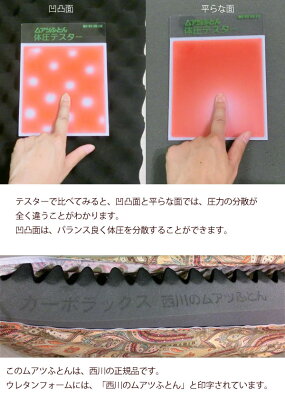 品質表示 サイズ 9×91×200cm(シングル) 側地 綿100% 詰め物 ウレタンフォーム カーボラックス&備長炭加工 製造 日本製 重さ 約5〜6kg 硬さ 180ニュートン (やや硬め) 商品のポイント ■ムアツ6つの特長 1)気持ちいい寝心地 点で支える独自構造のため身体との接触面が少なくなり、血行を妨げにくい。