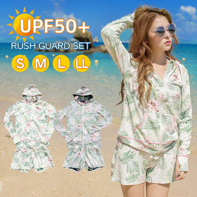 【メール便送料無料】 【即納】 ラッシュガード レディース 上下セット 水着 UVカット パーカー 長袖 ショートパンツ サーフパンツ 紫外線対策 日焼け防止 体型カバー ジップアップ ラッシュパーカー フード付き 指穴付き 2点セット ボタニカル
