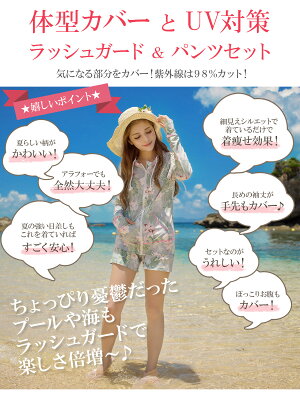 【メール便送料無料】 【即納】 ラッシュガード レディース 上下セット 水着 UVカット パーカー 長袖 ショートパンツ サーフパンツ 紫外線対策 日焼け防止 体型カバー ジップアップ ラッシュパーカー フード付き 指穴付き 2点セット ボタニカル
